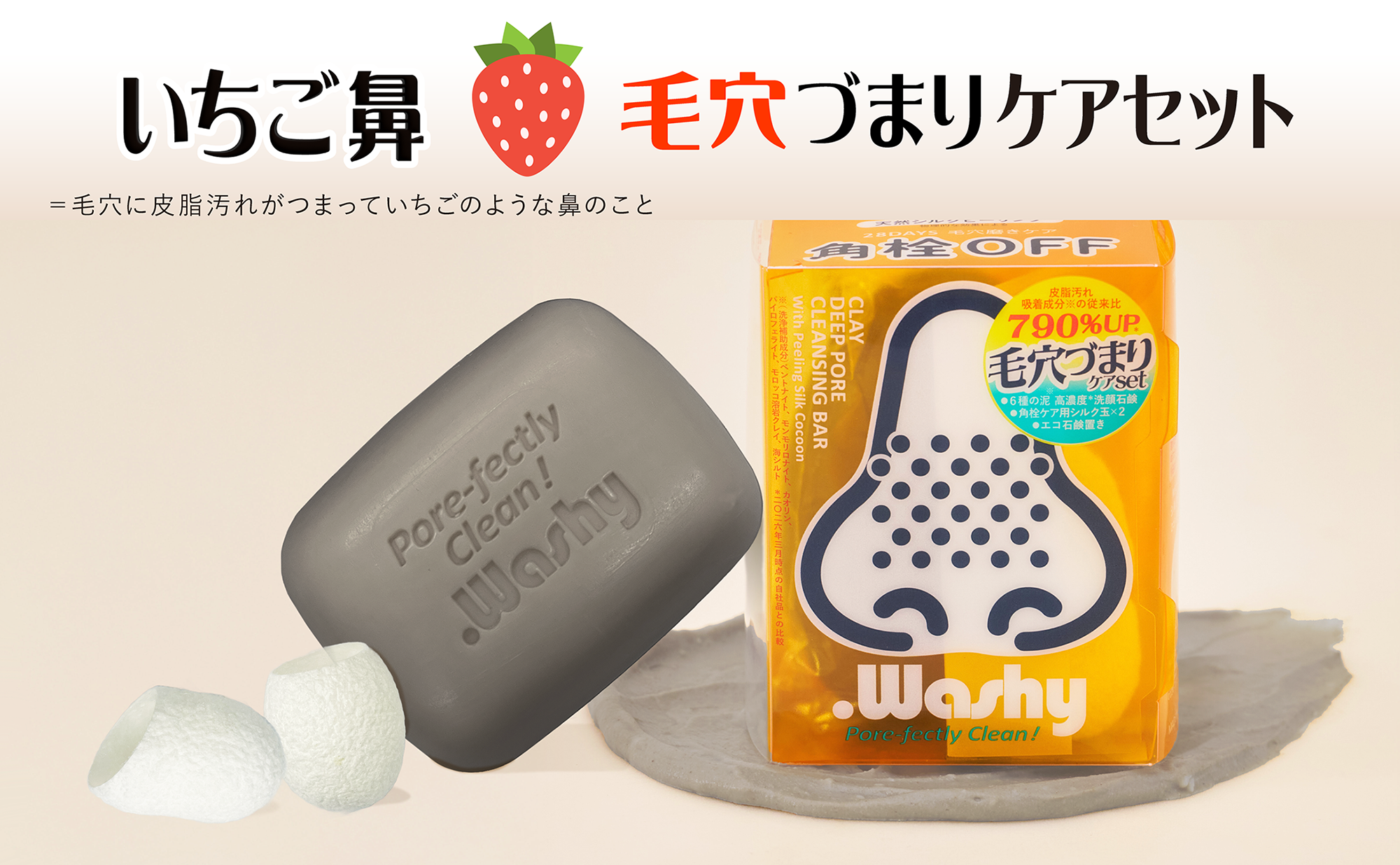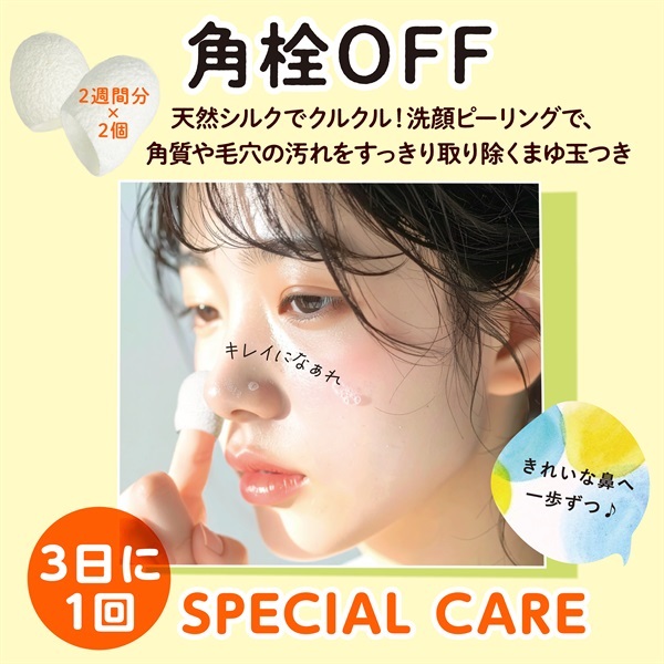 毛穴の汚れを吸着洗浄する「濃厚泡洗顔せっけん」と、シルク玉(まゆ玉)で小鼻を磨く「天然シルクピーリング」のWケア。
