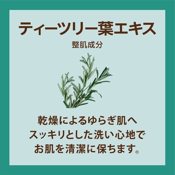 乾燥によるゆらぎ肌へ。スッキリとした洗い心地でお肌を清潔に保つ、整肌成分「ティーツリー葉エキス」を配合しています。