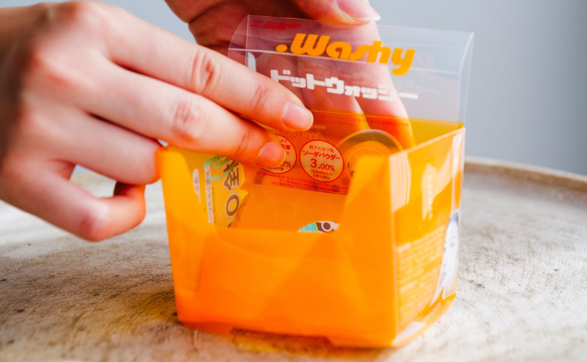 そんなお悩みに応え、この『ドットウォッシー』のパッケージは、3カ所を折り込むだけで簡単にせっけん置きに変身する仕様に!気軽にせっけんにトライしてもらえるように工夫しました。せっけんを斜めに置けて、水抜きの穴も開いているので、せっけんにとってもやさしい環境。最後までしっかりと使えて、お風呂環境もキレイに整います。