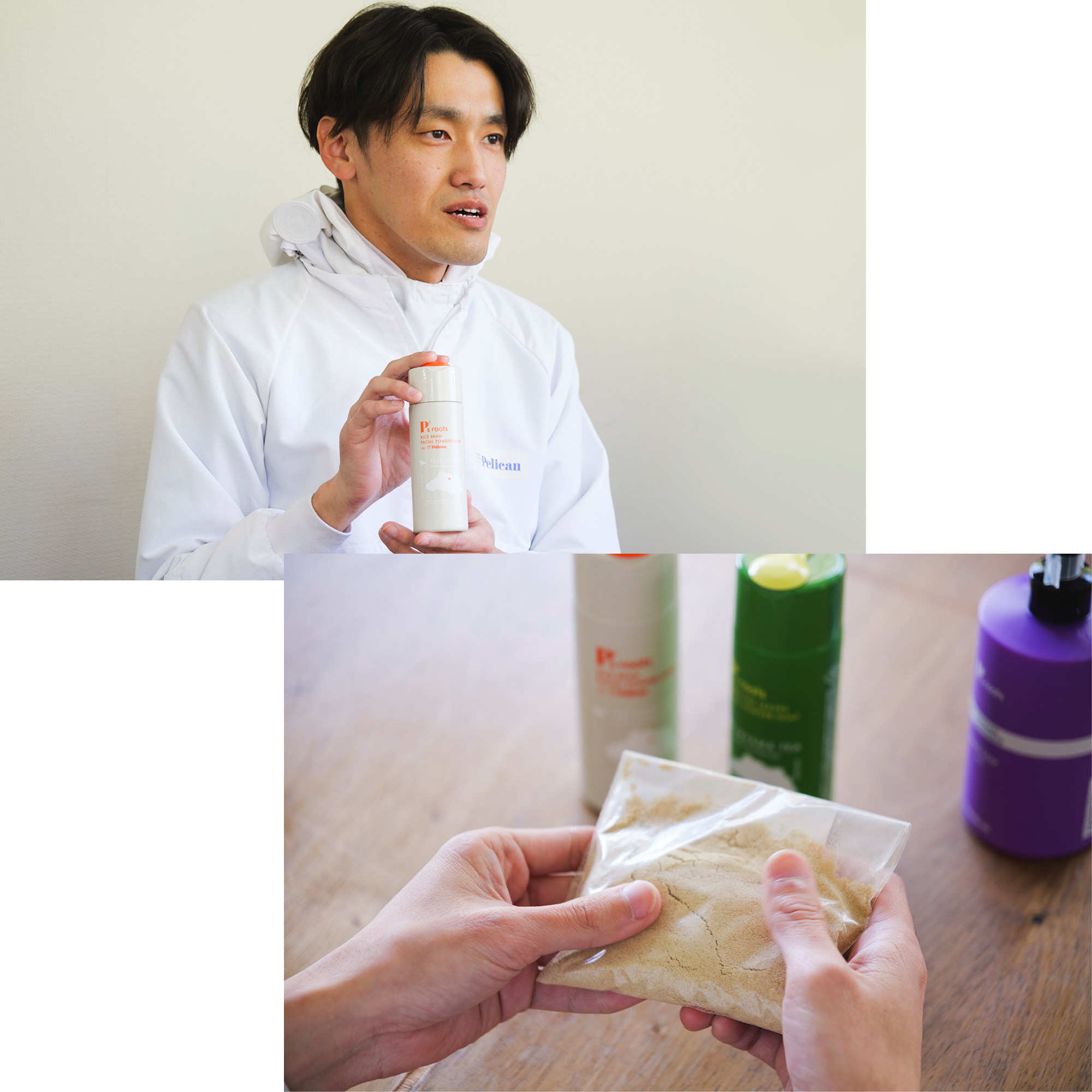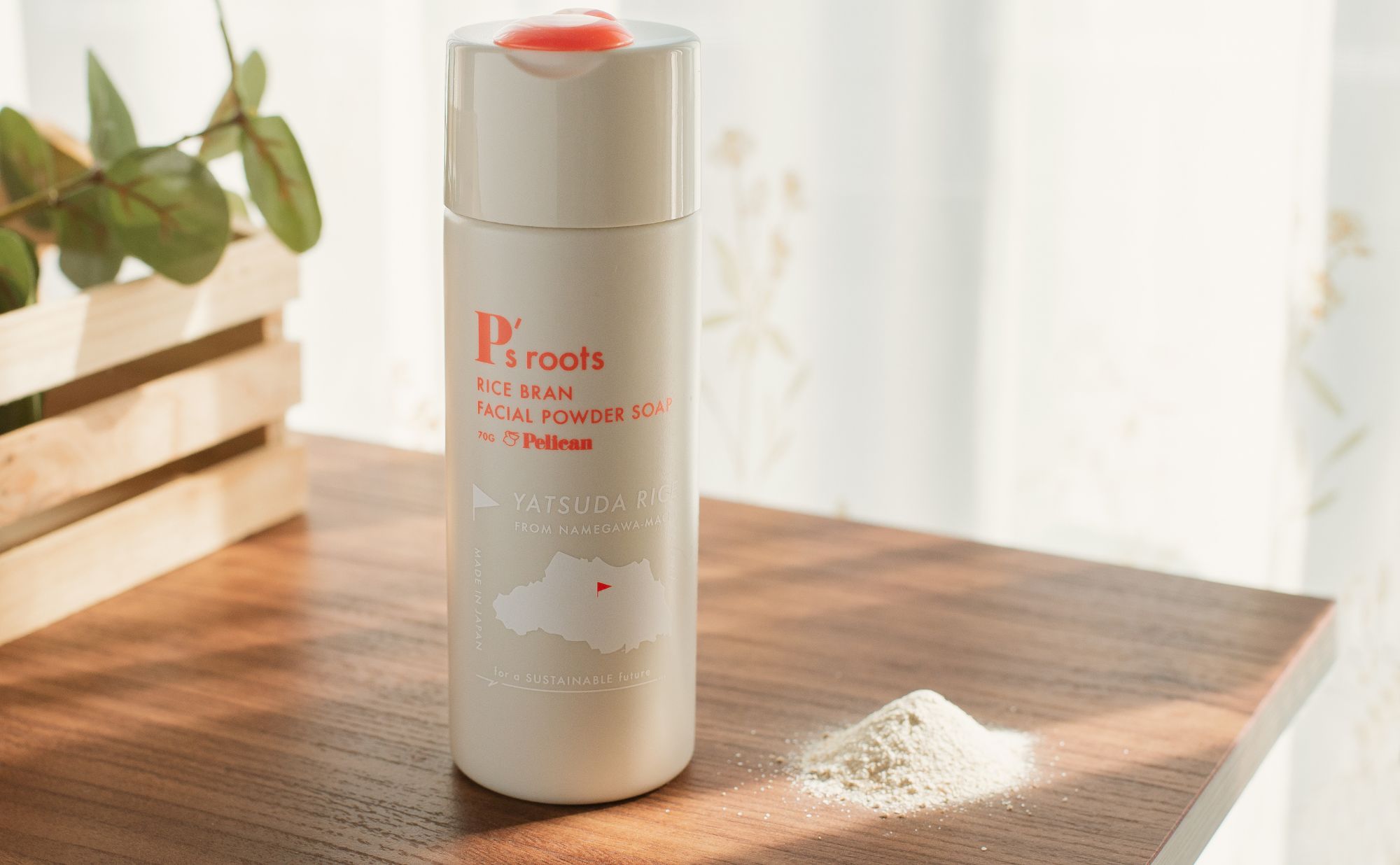 埼玉県・深谷市の自社工場で、独自の視点からの商品開発を手がけている『ペリカン石鹸』。モノづくりの精神を大切にしているこの工場が、地元・埼玉県の選りすぐりの天然由来素材を使い、手間ひまをかけて開発したのが『P's roots(ピーズルーツ)』ブランドです。Pはもちろん、ペリカンのP。ペリカンの原点=ルーツ(roots)である地元の素材を使って、お肌にも環境にも優しい洗浄アイテムができないものか…。そんな発想から、他にはない特別なラインアップが誕生しました。そのすべてのきっかけとなったのが、今回の主役『ピーズルーツ 米ぬか酵素洗顔パウダー』なのです。