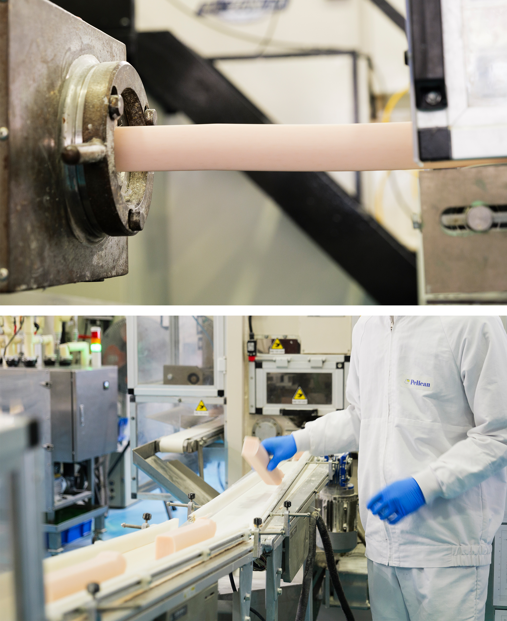 しっかりと練られたせっけんは、細長い棒状に押し出されてきます。この時点では、ソフトキャンディや生キャラメルのような感じで柔らかく、まだ温かい状態。温度はだいたい40度くらいです。このあと成型するので、適当な間隔で間引いて、機械が詰まらないように調整します。