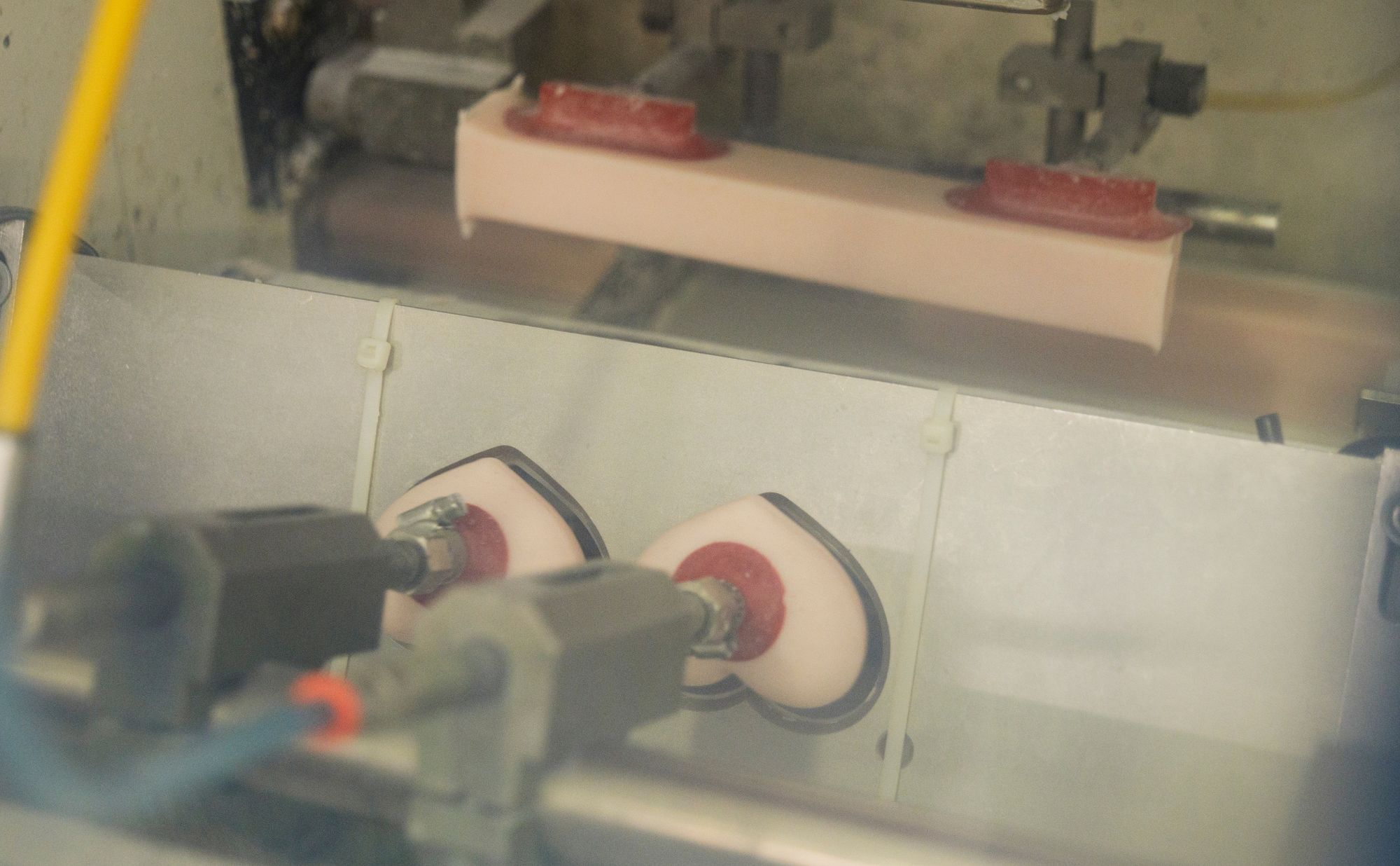 できたせっけんは、形が崩れないように吸盤で型から外して、ベルトコンベア上にそっと落とします。1分間に約100個のペースで、せっけんが誕生する瞬間です。