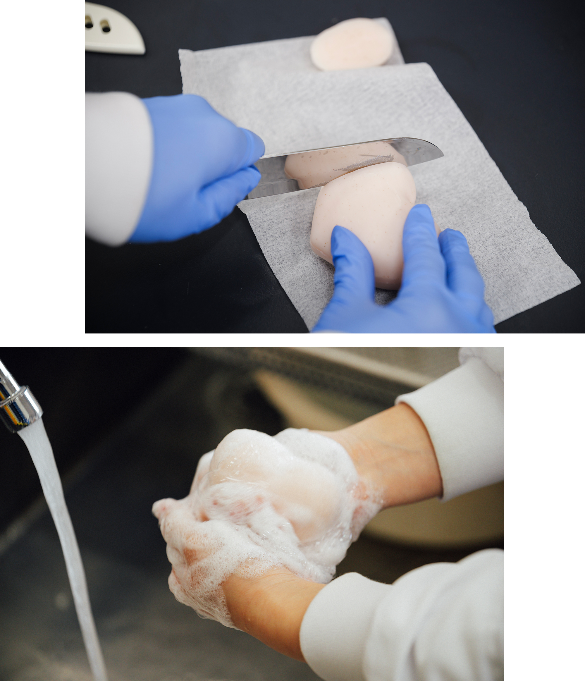 せっけんが出来上がってからも、定期的にサンプリング検査を実施。カットしてさまざまな機械による試験や解析をするほか、人間の五感で、泡立ち具合や香りの立ち方、色やテクスチャーなどを確認する官能検査を実施しています。もちろん、スタッフが工場に入るときは、防じん服とエアシャワーで、しっかりとチリやホコリを取り除いてから。日々の衛生管理も徹底しています。