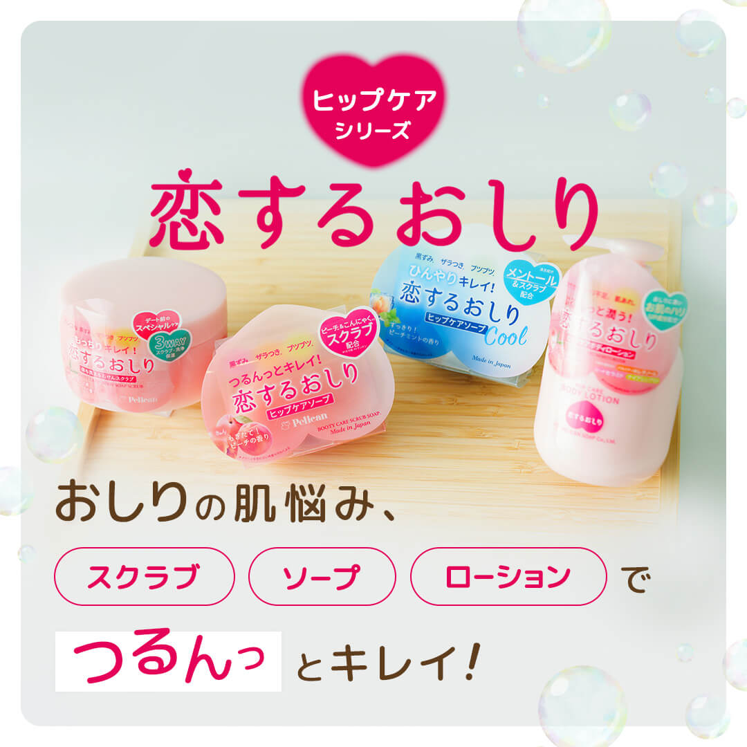 ソープ、ローション、スクラブで、おしりの肌悩み、つるんっとキレイ!恋するおしり ヒップケアシリーズ